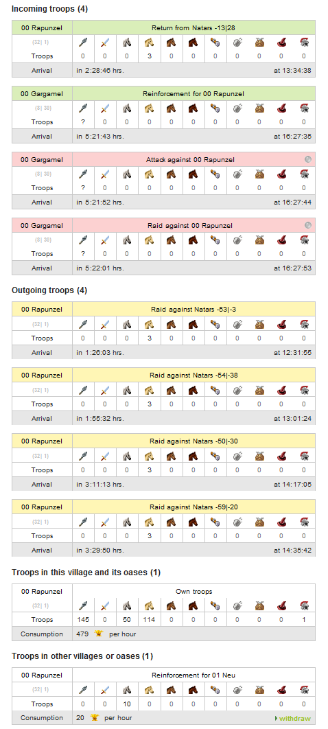 If the number of all units within an attack/raid is lower than the current Rally Point level of the defending village, the defender will see the unit types approaching his village. He will not see the exact numbers, but the unit types only. In the image above you can see approaching Phalanxes. No other unit types are approaching within that attack or the following raid.