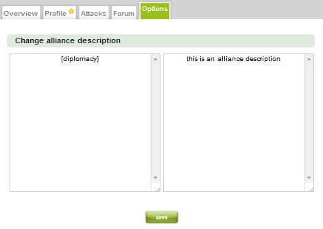 Much like a player, each alliance can have its own profile. Using this option, you can add text which will better describe your alliance – what you require of players, the basic set of alliance rules, a general introduction, etc. There are two large text boxes here – one on the left, and the other on the right. Placing text in either of these will have the text displayed on either the left or right (depending on the text box used) of the alliance profile in-game.