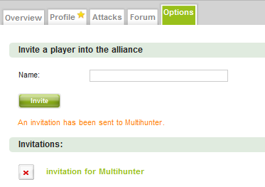 To invite a player into the alliance, all you need to do is enter the player’s (account) name. If the player is already a member of another alliance, they will have to quit their alliance first before they can join yours.