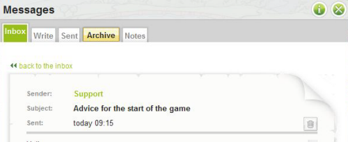 Click the circle and open the message by clicking on the green link symbolising the subject of the message. The subject sould be “Advice for the start of the game”. When you click it, you will open the message and complete the task.