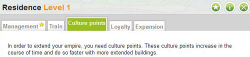Description: In order to reign over more villages in your empire, you need culture points. The overview in the residence tells you how far away you are and how long it is going to take.