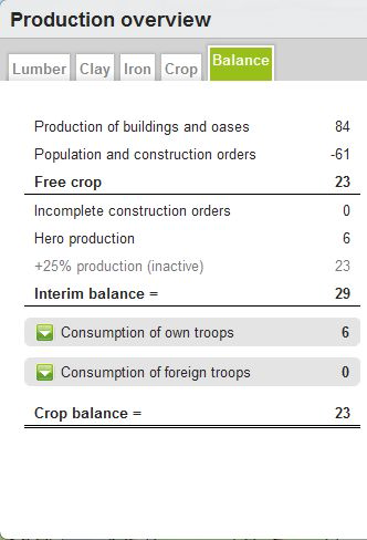 Balance is a special tab displaying free crop, bonus crop production, consumptions of buildings and troops and at the end, the total crop production.