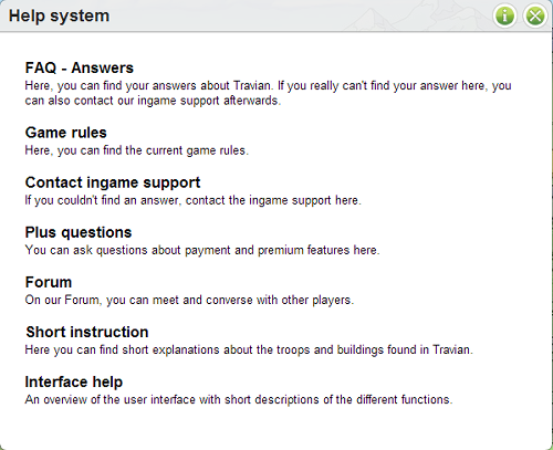 Short instruction: This will bring up the dialog that you can use to get quick information about Travian, mostly the buildings and troops.