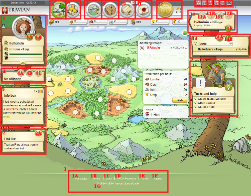 14. This is your villages list. It provides you clean list of all of your villages. By clicking on the village names, you will change villages so that you can upgrade in other villages. 14A will bring up the statistics on your village and 14B will display the village’s coordinates.