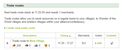To set a trade route, you have to go to the marketplace. Once you have more than 1 village, the trade routes will appear. What you see here is the screen you get when you have no trade routes set yet. To create a trade route, you have to click the “Create new trade route” link.